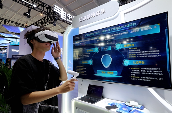 华为公司现场展示基于“AI对抗AI”理念推出的星河AI网络安全解决方案,中国电信展区系统呈现从基础设施到应用场景的全栈安全体系。